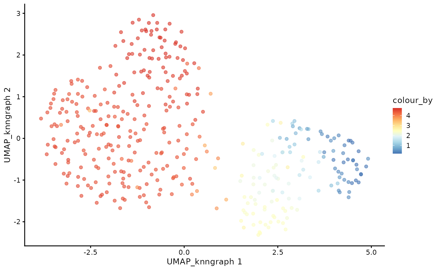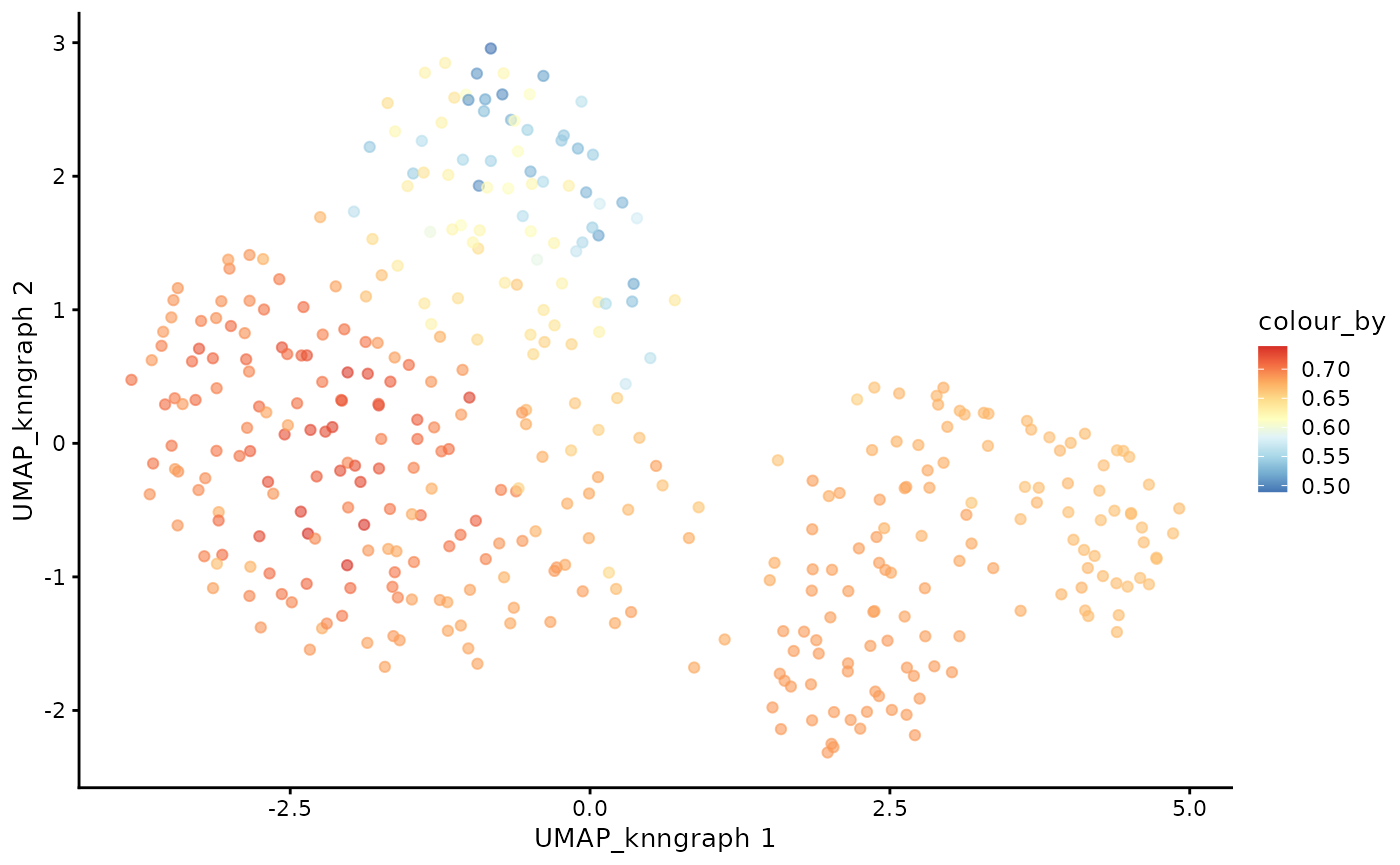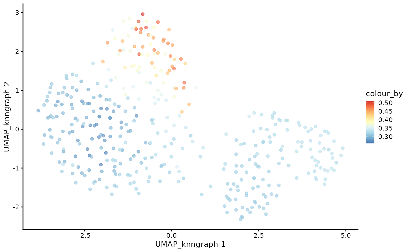 plotUMAP(cdata, color_by = "CD4+T", dimred = "UMAP_knngraph") +